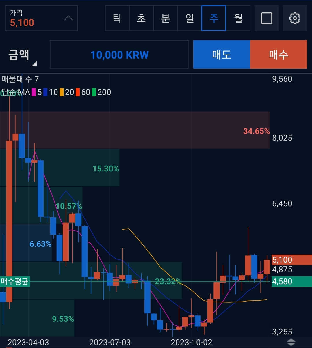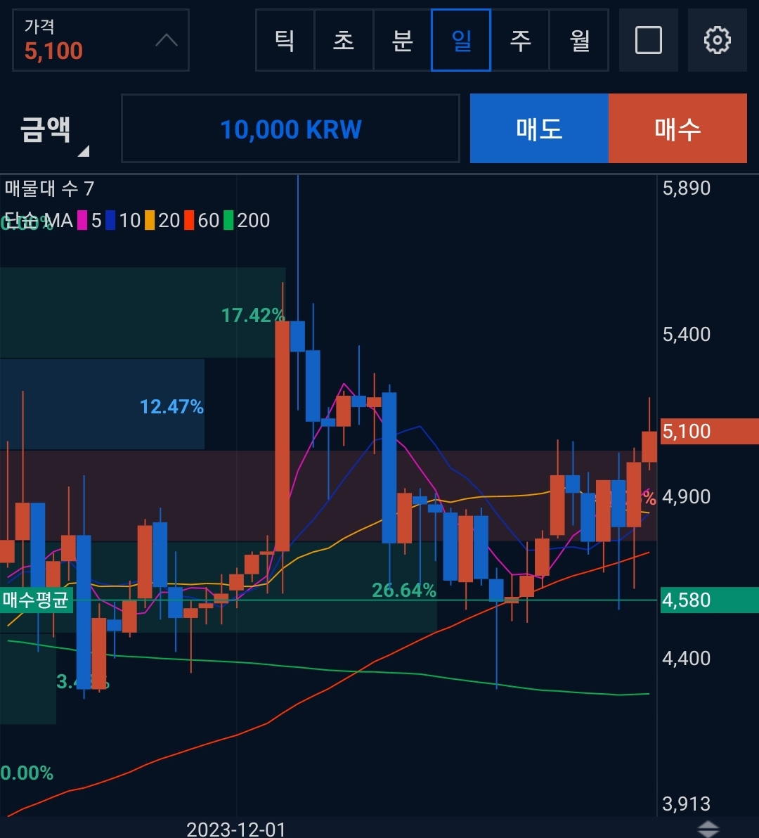 비트코인이 6100만원을 터치하고 현제 5750만원대를 기록중이다. 현재 나는 6100만원대에서 20%의 비트코인을 익절하고 대기중이다. 2023년 12월 01일 업비트 원화마켓의 모든 알트코인을 1만원씩 매수했고 마스크 네트워크(MASK)코인은 현재 평균매수가 4,580원 현재가 5,100원으로 11%정도의 수익구간을 유지하고 있다.