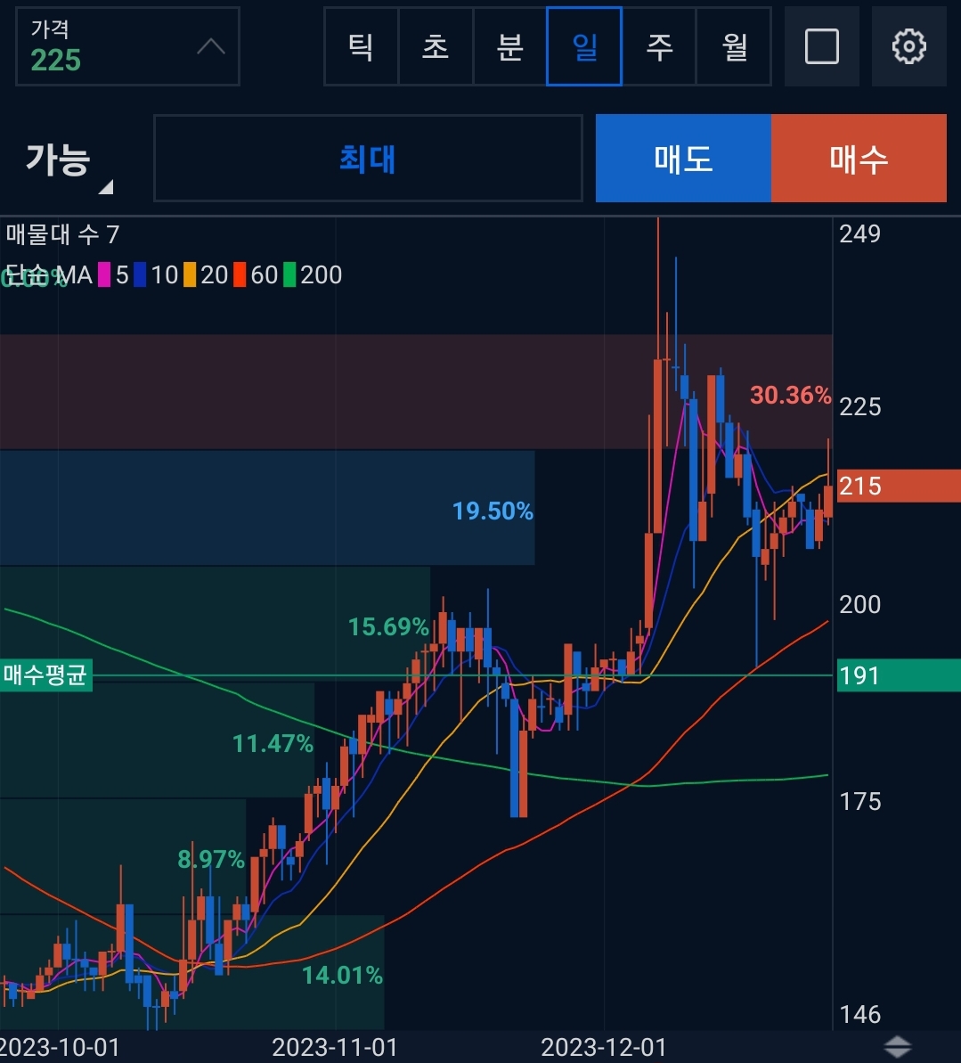 비트코인이 6100만원을 터치하고 현제 5700만원대를 기록중이다. 현재 나는 6100만원대에서 20%의 비트코인을 익절하고 대기중이다. 2023년 12월 01일 업비트 원화마켓의 모든 알트코인을 1만원씩 매수했고 보라(BORA)코인은 현재 평균매수가 191원 현재가 215원으로 12%정도의 수익구간을 유지하고 있다.