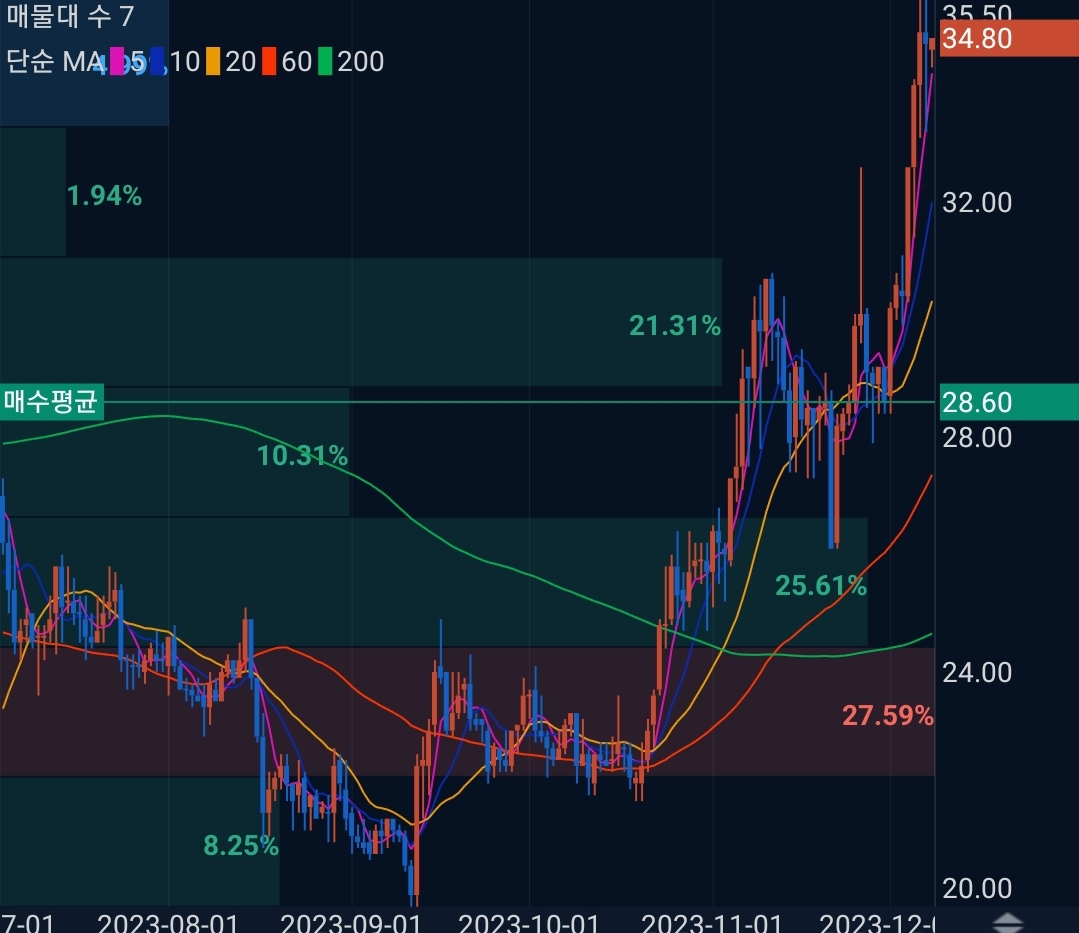 2023년 12월 01일 업비트 원화마켓의 모든 코인을 1만원씩 구매했습니다. 이번 시간에는 비체인(VET) 코인에 대한 상황을 알아보겠습니다. 구매가는 28.60원 현재가 34.80원 21% 수익중입니다. 순환매에서 펌핑오는 코인을 팔고 오르지 않은 코인으로 옮겨가면서 수익을 낼 계획입니다.