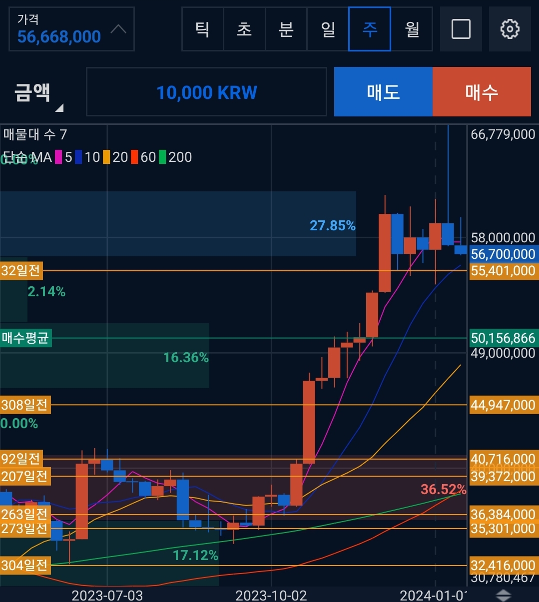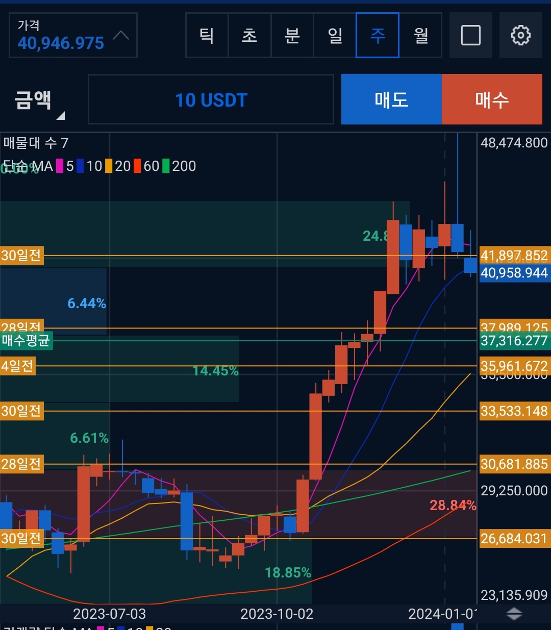비트코인은 ETF 승인이후로 지속적인 조정을 받고 있다. 현재 나의 평단은 37k를 유지하고 있다. 매일 일정금액을 매수하고 평단 아래로 내려오면 더 매수를 하는 방식을 유지하고 있다. 그리고 30% 이상의 하락을 기대하고 있다. 개인적인 입장으로는 아직 조정다운 조정이 나오지 않았다고 본다. 비트코인 대상승장에서도 30% 이상의 조정은 언제나 가지고 왔다. 때문에 언제나 현금 비중을 30프로는 유지중이지만 현재는 50%현금비중을 유지중이고 페닉셀을 대비하고 있다.