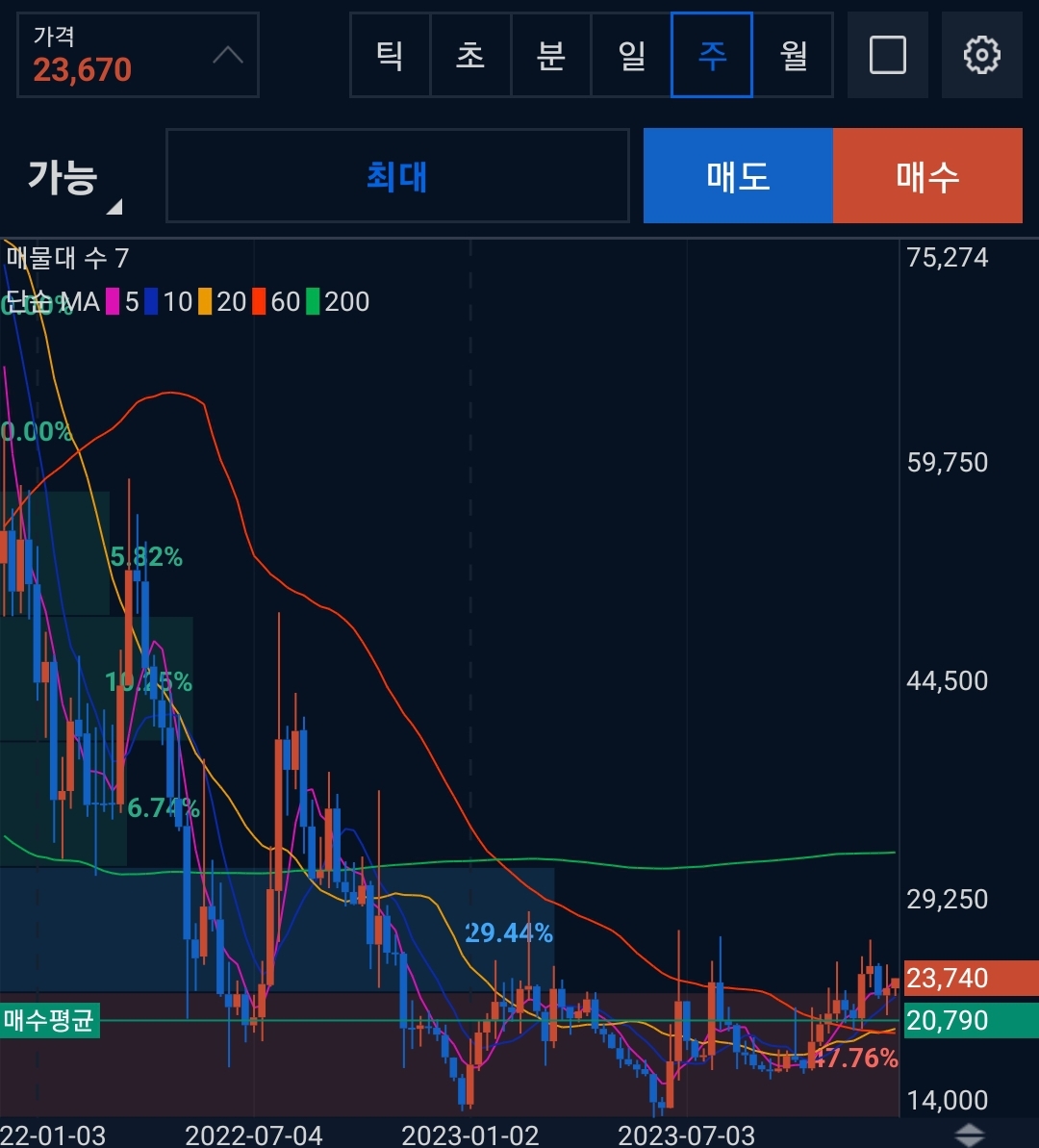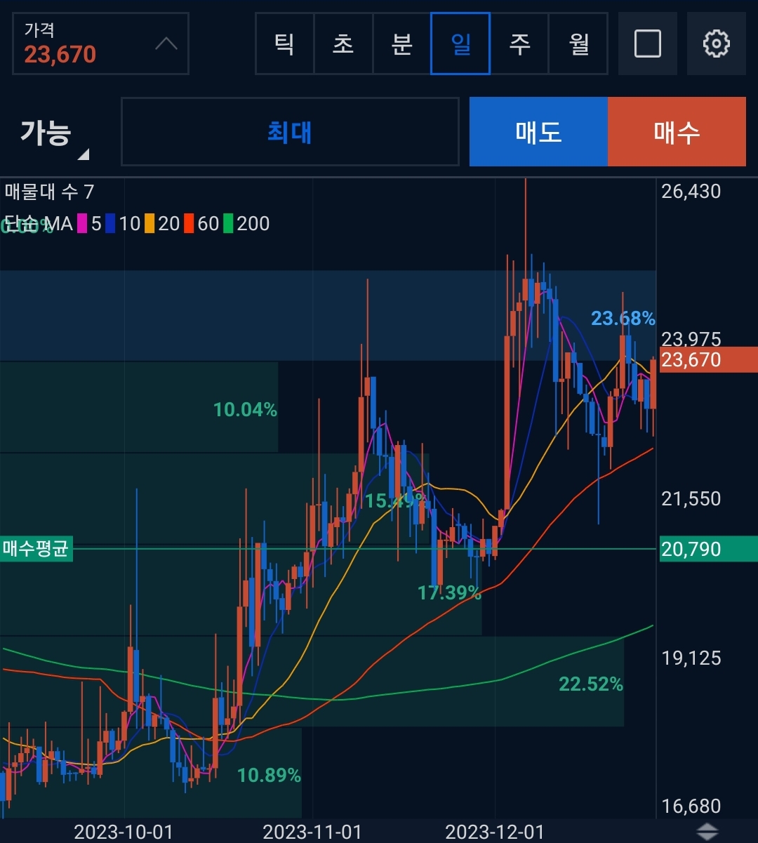 비트코인이 6100만원을 터치하고 현제 5650만원대를 기록중이다. 현재 나는 6100만원대에서 20%의 비트코인을 익절하고 대기중이다. 2023년 12월 01일 업비트 원화마켓의 모든 알트코인을 1만원씩 매수했고 베이직 비트코인 골드(BTG)코인은 현재 평균매수가 20790원 현재가 23670원으로 13%정도의 수익구간을 유지하고 있다.