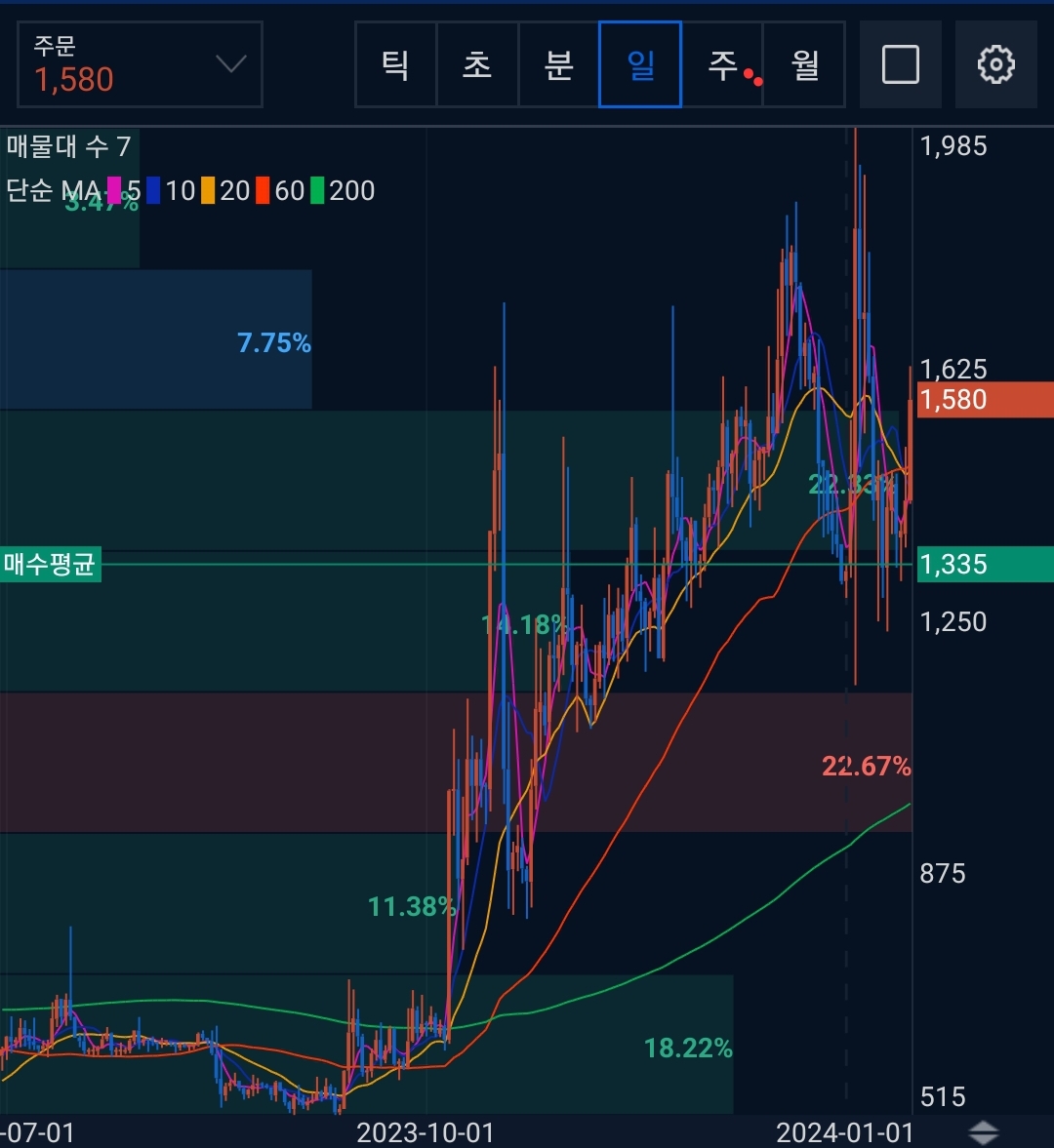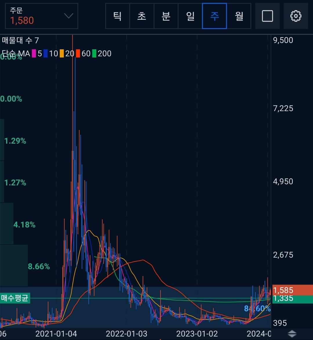 일봉상으로로 강력한 매수세나 호재가 나와있지 않고 비트코인에 따라 움직이는 중이다. 이 코인은 보토 초 불장이 왔을때난 크게 상승하는 패턴을 보이고 있고 24년의 메타와는 맞이 않는 것처럼 보인다. 홀딩하기에는 기회비용이 조금 아까워 보인다. 하지만 추세를 보기위해 아직 단 하나의 코인도 팔지 않았다.