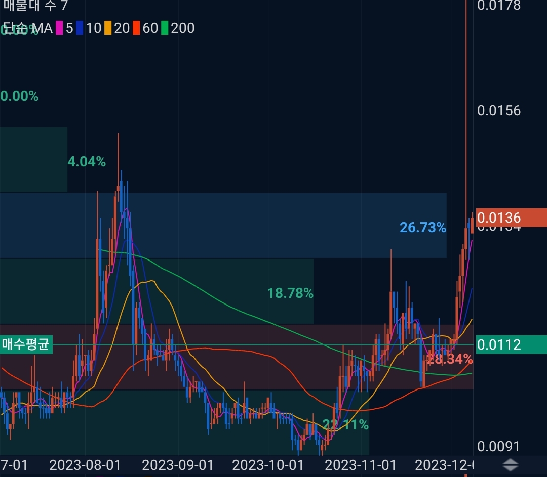 2023년 12월 01일 업비트 원화마켓의 모든 코인을 1만원씩 구매했습니다. 이번 시간에는 시바이누(SHIB) 코인에 대한 상황을 알아보겠습니다. 구매가는 0.0112원 현재가 0.0136원 21% 수익중입니다. 순환매에서 펌핑오는 코인을 팔고 오르지 않은 코인으로 옮겨가면서 수익을 낼 계획입니다. 참고로 저는 비트코인의 비중이 대부분입니다.