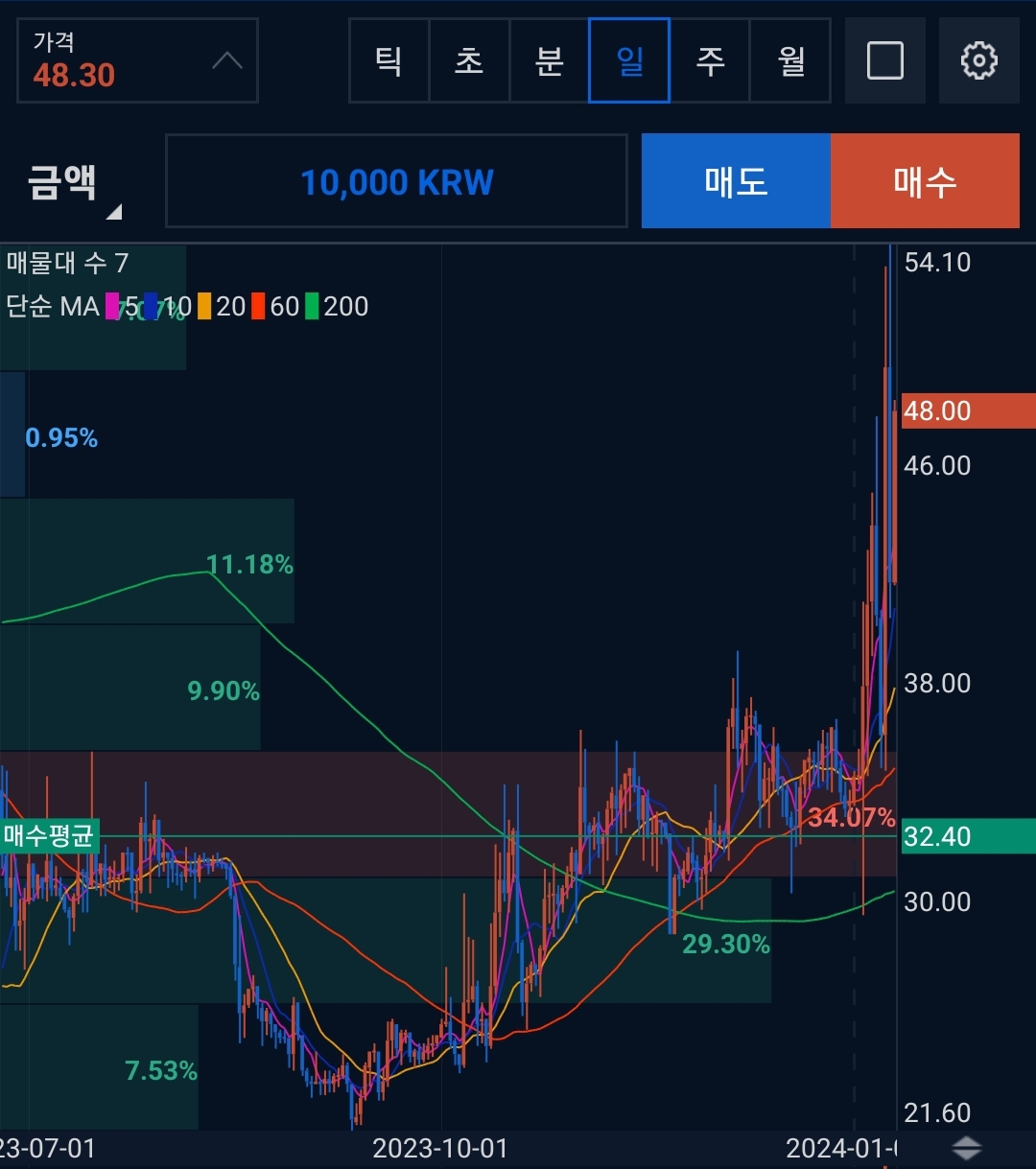 주봉으로 먼저 보면 쓰레스홀드느느 삼각수렴후 완연한 상승의 모습을 보이고 있다. 그리고 나는 23년 12월 01일 쓰레스홀드 홀드를 32.40원에 매입했다. 알트의 흐름을 보기 위해서 모든 코인을 1만원씩 매수한 상태여서 큰 상승이 나와도 수익을 많지 않을 것이다. 특히 쓰레스홀드는 평소에 눈여겨 보던 코인이 아니었기에 무리하게 추가 매수를 하거나 불타기 물타기를 하지 않고 지켜만 보고 있는 중이다.