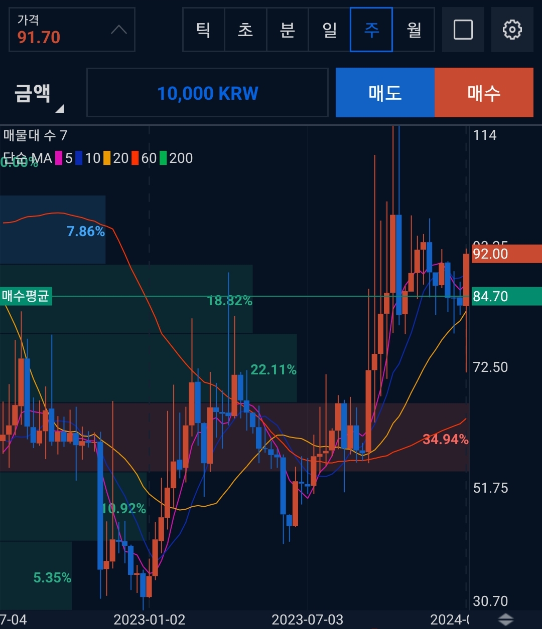비트코인이 6100만원을 터치하고 현제 5810만원대를 기록중이다. 현재 나는 6100만원대에서 20%의 비트코인을 익절하고 대기중이다. 2023년 12월 01일 업비트 원화마켓의 모든 알트코인을 1만원씩 매수했고 에스티피(STPT)코인코인은 불타기로 1만원 추가 매수했다. 현재 평균매수가 84.70원 현재가 91.70원으로 9% 수익중이다.