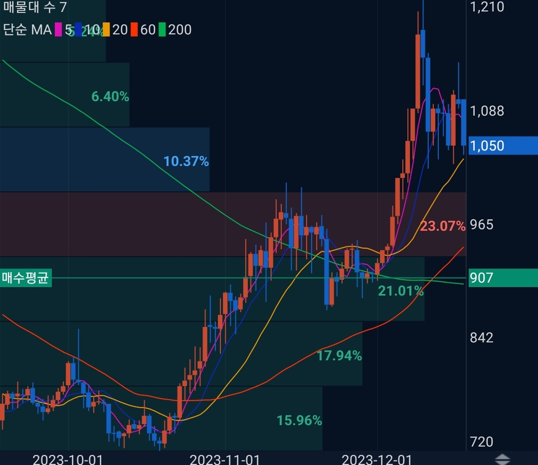 비트코인이 6100만원을 터치하고 현제 5600만원대까지 하락 조정을 받고있다. 현재 나는 6100만원대에서 20%의 비트코인을 익절하고 대기중이다. 2023년 12월 01일 업비트 원화마켓의 모든 알트코인을 1만원씩 매수했고 이오스(EOS)코인은 현재 평균매수가 907원 현재가 1050원으로 15%정도의 수익구간을 유지하고 있다.