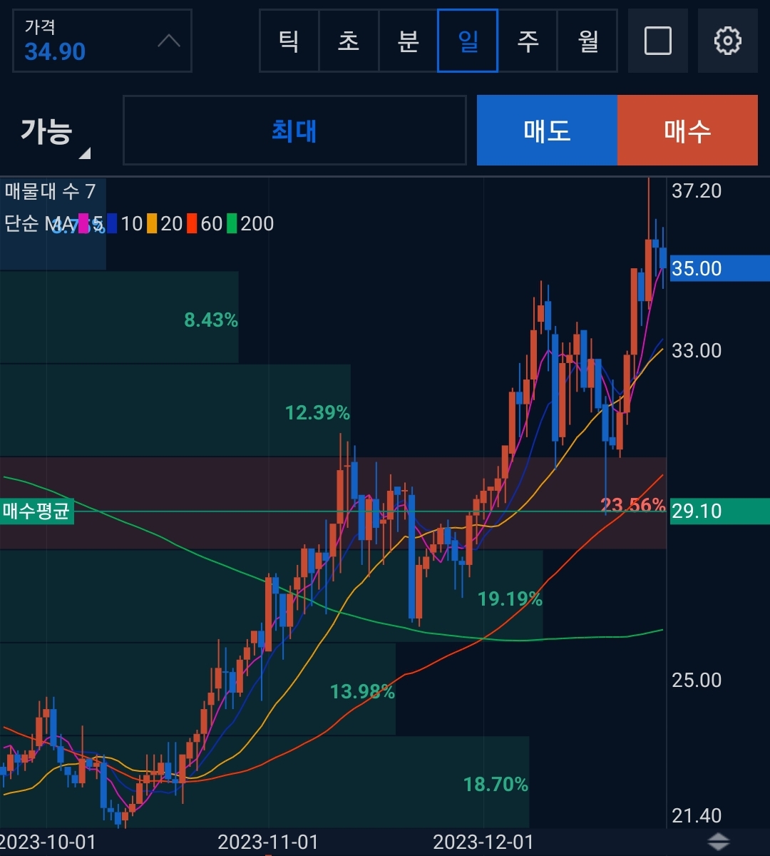 비트코인이 6100만원을 터치하고 현제 5700만원대를 기록중이다. 현재 나는 6100만원대에서 20%의 비트코인을 익절하고 대기중이다. 2023년 12월 01일 업비트 원화마켓의 모든 알트코인을 1만원씩 매수했고 질리카(ZIL)코인은 현재 평균매수가 29.1원 현재가 35원으로 19%정도의 수익구간을 유지하고 있다.