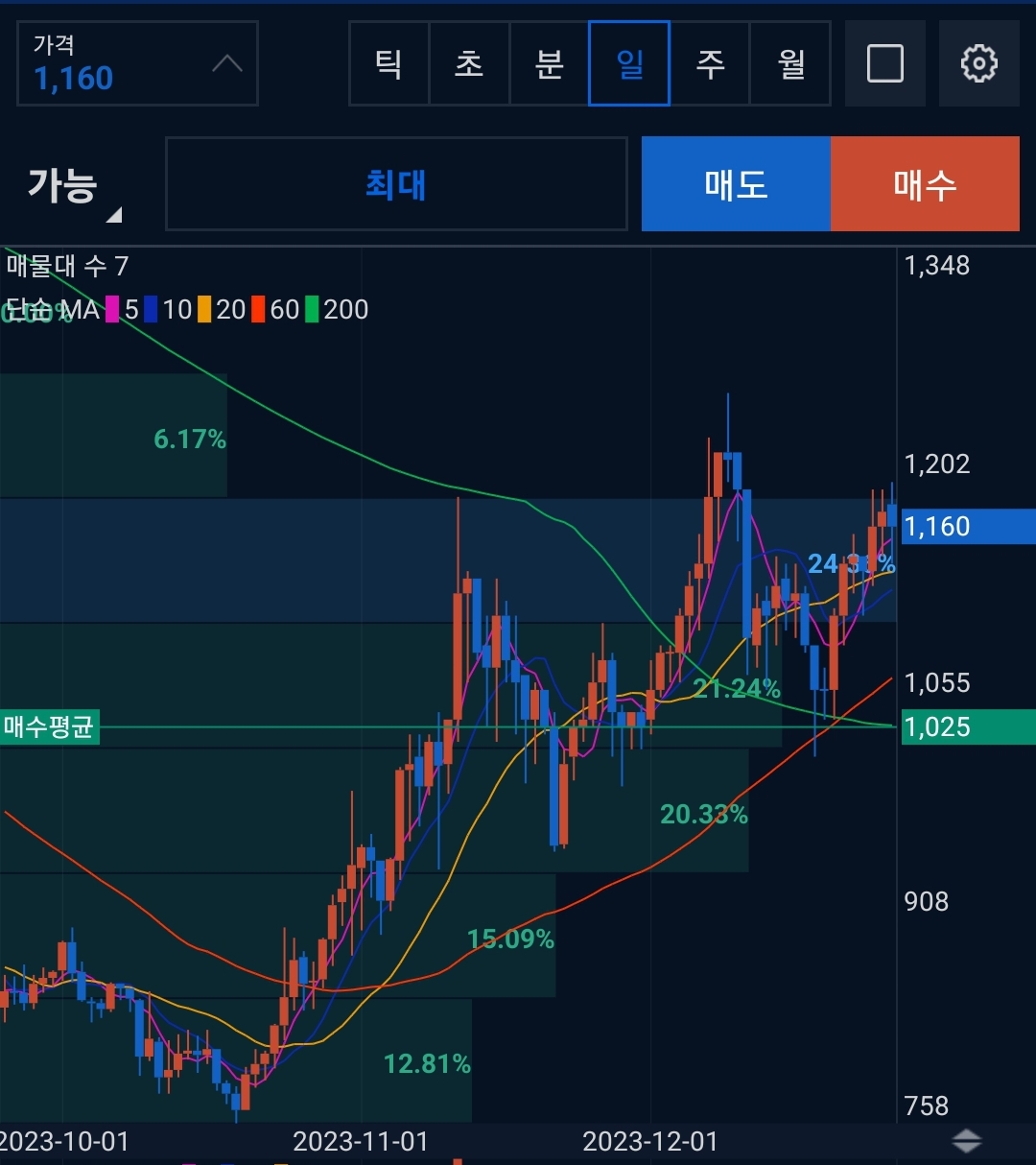 비트코인이 6100만원을 터치하고 현제 5700만원대를 기록중이다. 현재 나는 6100만원대에서 20%의 비트코인을 익절하고 대기중이다. 2023년 12월 01일 업비트 원화마켓의 모든 알트코인을 1만원씩 매수했고 카바(KAVA)코인은 현재 평균매수가 1025원 현재가 1160원으로 13%정도의 수익구간을 유지하고 있다.